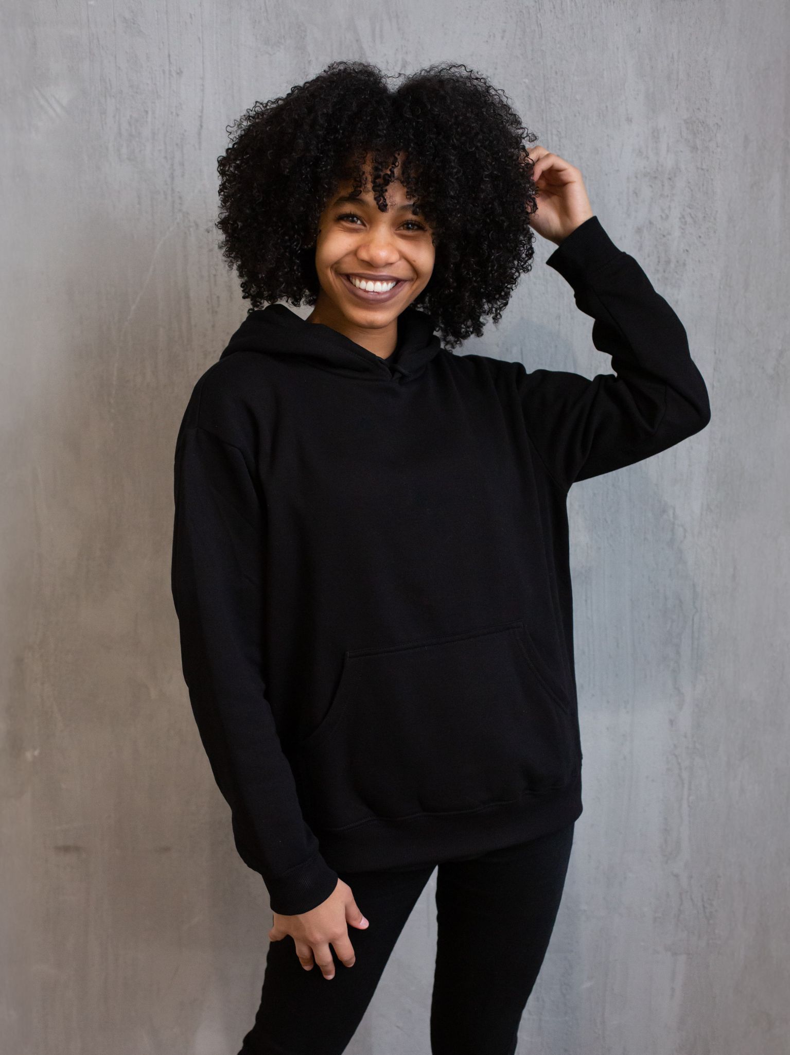 • Oversized, relaxed fit with hood and long sleeves